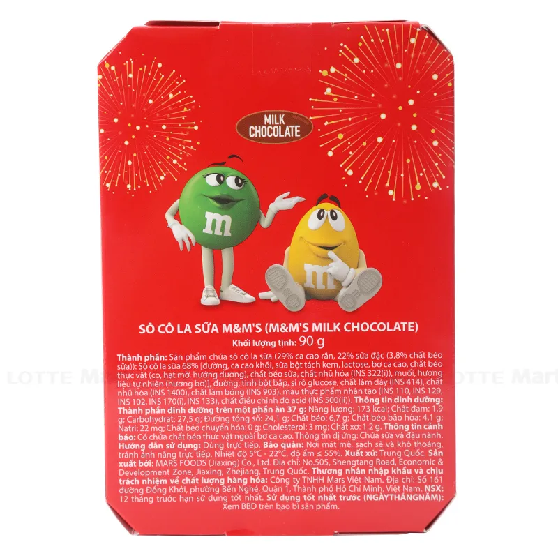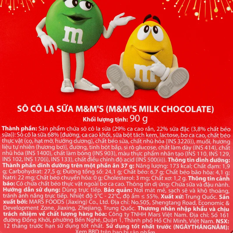 Kẹo Socola Sữa M&M’s với các viên tròn nhỏ nhiều màu sắc vui tươi, sự hòa quyện độc đáo giữa vị ngọt ngào của lớp kẹo bên ngoài và vị béo ngậy của socola sữa bên trong. Sản phẩm có thành phần làm từ nguyên liệu sô cô la sữa, sữa bột nguyên kem, bơ cacao, tinh bột, bơ sữa, dầu thực vật...được chọn lựa kỹ lưỡng bởi các chuyên gia trong ngành ẩm thực, không chứa hóa chất độc hại, an toàn cho sức khỏe người sử dụng.