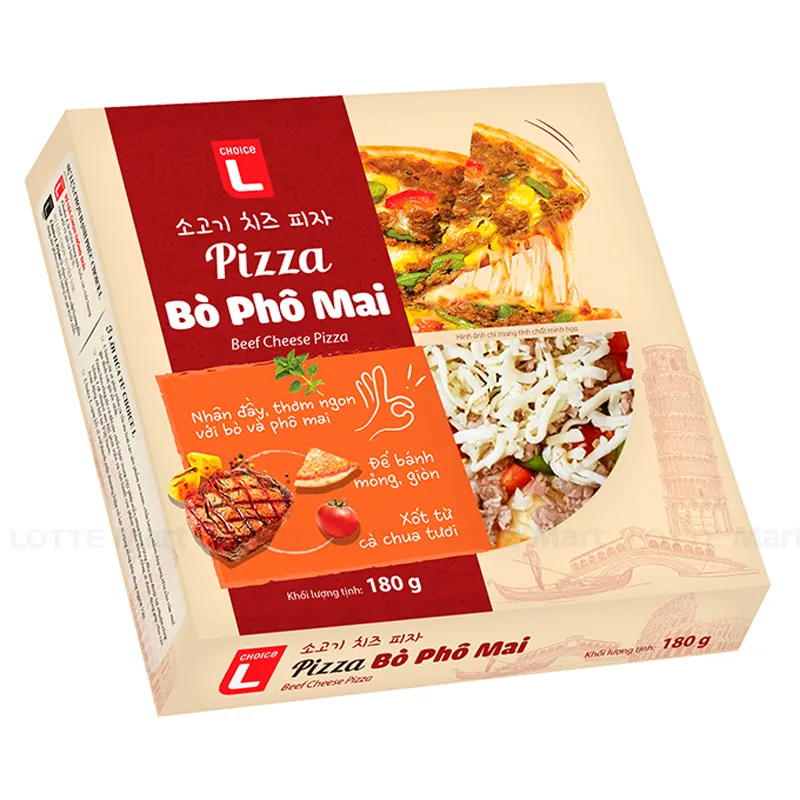 - Pizza Bò Phô Mai Choice L 180g với đế bánh mỏng, ngoài giòn tan, trong mềm mượt, bột làm đế bánh được trộn đều với men thô và các gia vị theo tỷ lệ vàng sau đó được ủ trong nhiều giờ ở nhiệt độ thấp để kích thích việc hình thành sợi gluten trong bột giúp tăng hương vị cho bánh, tạo ra phần đế có hương vị đậm đà đặc trưng.