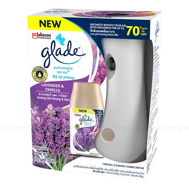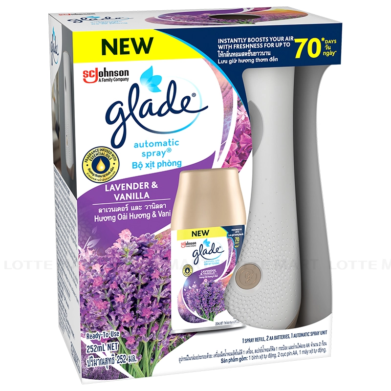- Bộ Xịt Phòng Tự Động Glade Hương Oải Hương và Vani được sản xuất theo công nghệ hiện đại, sử dụng các thành phần tự nhiên, đảm bảo cho không gian sống của bạn có hương thơm tinh khiết, cho căn phòng luôn ngập tràn mùi thơm đến 60 ngày.