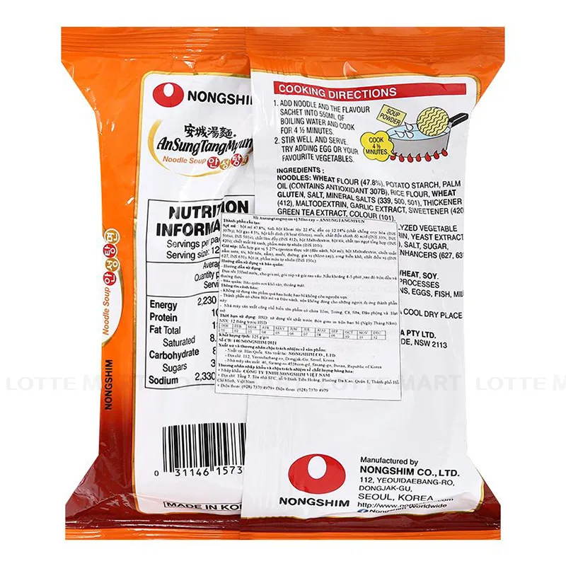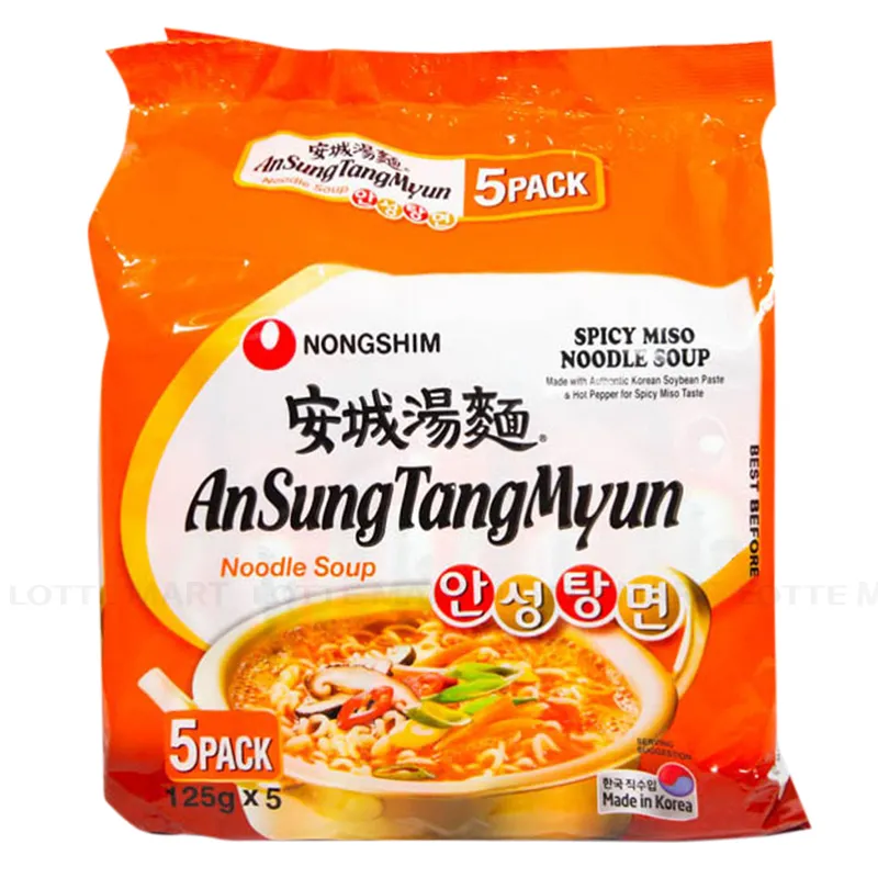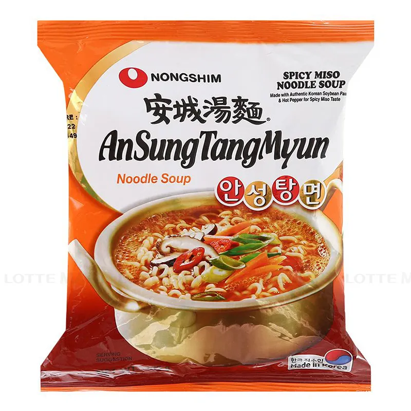 - Mì AnSungtangmyun Lốc 5 Gói 125G với sợi mì dai, mềm cùng nước súp miso đậm đà, mùi thơm hấp dẫn và vị cay kích thích vị giác. Điều mới mẻ và gây thu hút người tiêu dùng ở sản phẩm mì lần này chính là Nongshim đã sử dụng thêm gạo cho vào kết cấu thành phần, làm tăng độ dai sợi mì ramen và tạo độ sánh cho nước súp.
