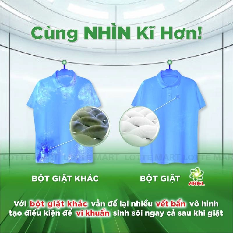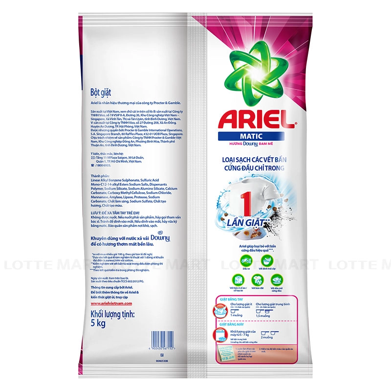 Bột Giặt Ariel Hương Downy giúp quần áo sạch hoàn hảo, khử mùi hôi. Loại bỏ các vết bẩn cứng đầu chỉ trong 1 bước ngay cả những vết bẩn khó giặt như dầu xe, vết dính trái cây, vết bẩn ở cổ áo, cổ tay áo, vết bùn đất, vết dầu mỡ cứng đầu