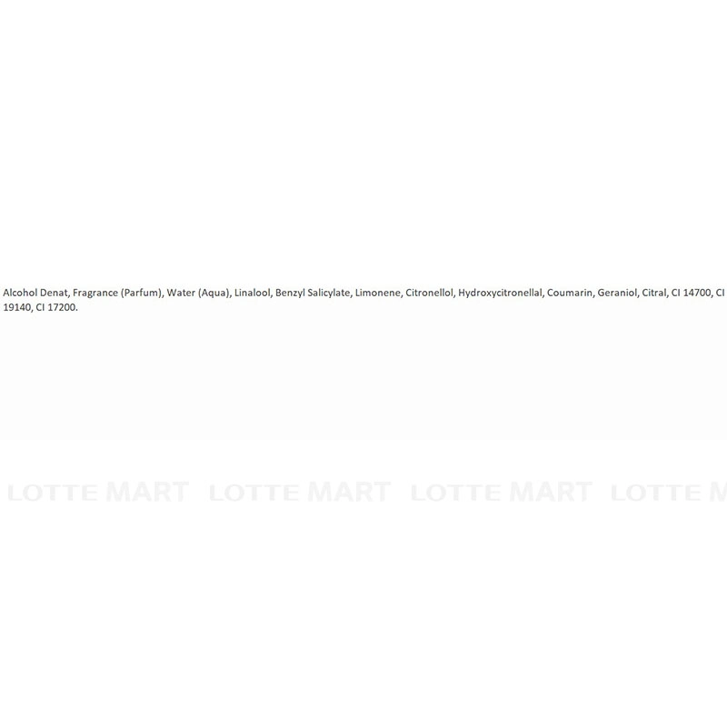 - Alcohol Denat, Fragrance (Parfum), Water (Aqua), Linalool, Benzyl Salicylate, Limonene, Citronellol, Hydroxycitronellal, Coumarin, Geraniol, Citral, CI 14700, CI 19140, CI 17200.