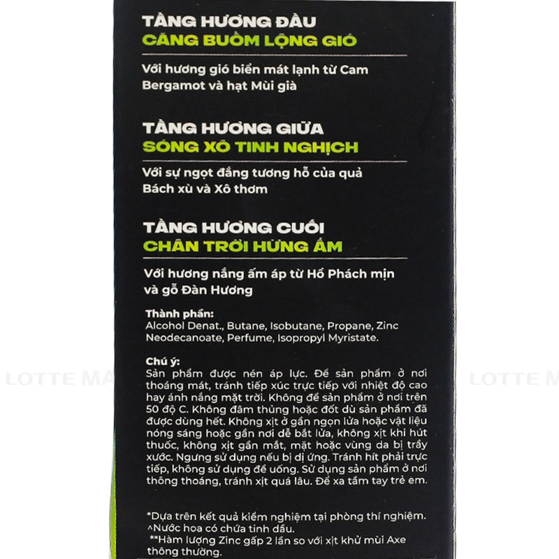 Xịt Ngăn Mùi Axe Hương Nước Hoa Aqua Bergamot chứa hơn 20 loại tinh dầu thiên nhiên cùng cấu trúc đặc biệt giúp lưu lại trên cơ thể tới 72 giờ, mang đến cảm giác tươi mới, dễ chịu cả ngày dài.