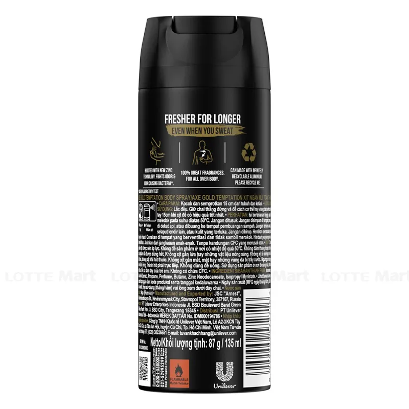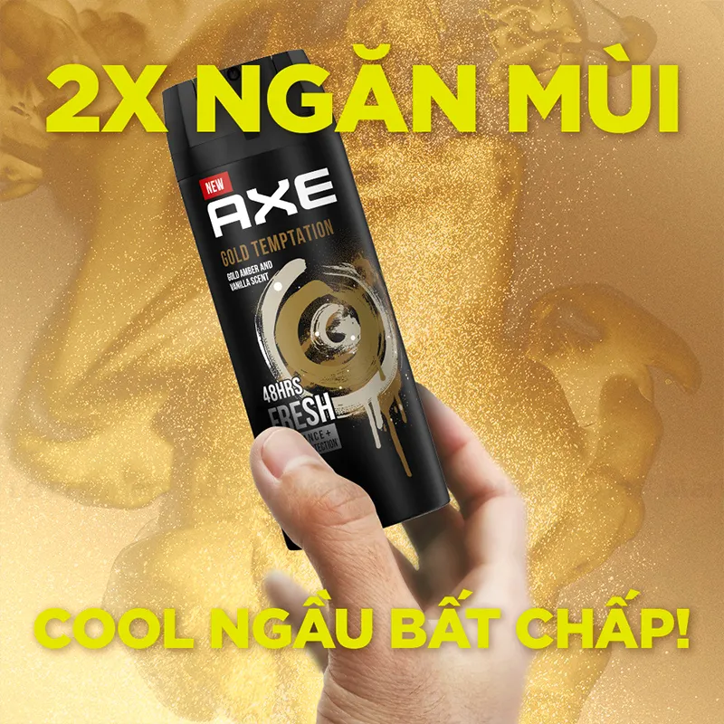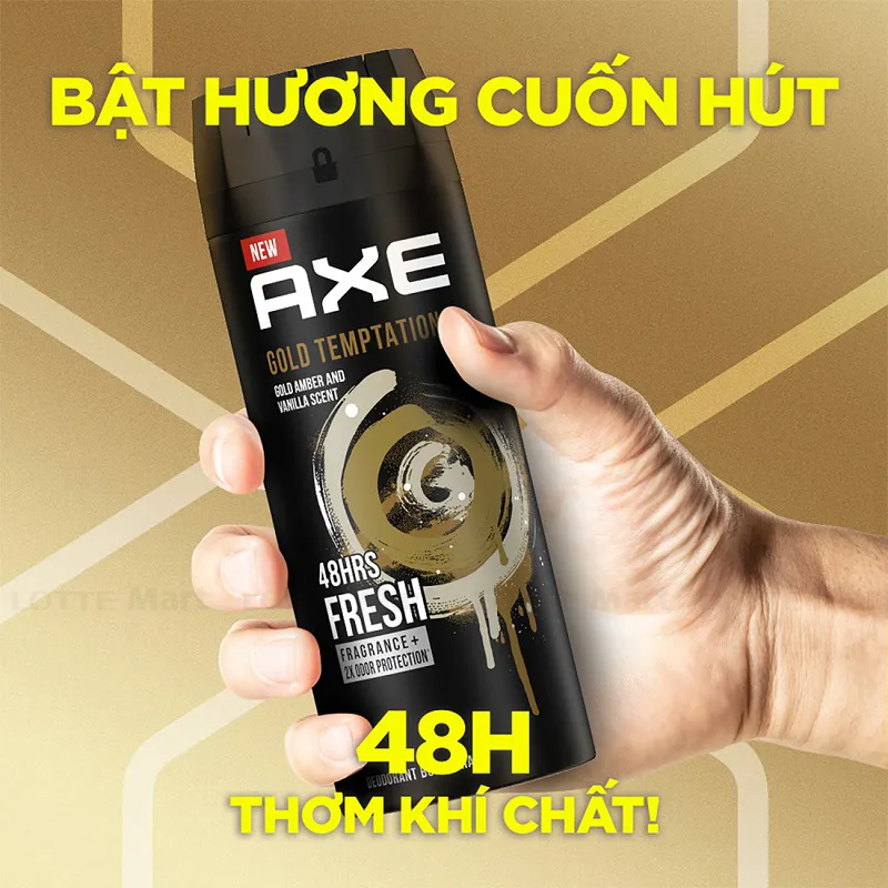 Xịt Ngăn Mùi Toàn Thân Cho Nam AXE #Gold Temptation là dòng sản phẩm khử mùi cho nam đến từ thương hiệu mùi hương nam AXE nổi tiếng thuộc tập đoàn Unilever, có khả năng khử mùi cơ thể hiệu quả, đồng thời mang đến hương thơm lôi cuốn và quyến rũ suốt 48h, giúp phái mạnh tự tin hơn trong mọi hoạt động.