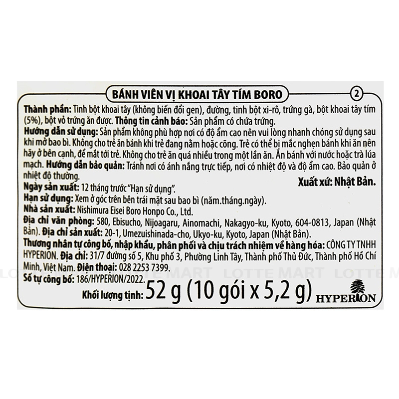 - Bánh Ăn Dặm Viên Khoai Tây Tím Boro Gói 52G được sản xuất từ khoai tây không biến đổi gen, khoai tây tím chất lượng, không thêm các chất bảo quản, đảm bảo an toàn cho sức khỏe bé.