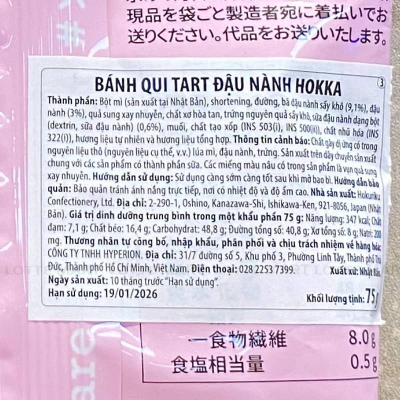 - Sản phẩm được sản xuất tại Nhật Bản, đảm bảo tiêu chuẩn chất lượng cao và an toàn thực phẩm. Bánh chứa nhiều chất xơ, rất tốt cho hệ tiêu hóa, Bánh Quy Tart Đậu Nành Hokka là lựa chọn hoàn hảo cho những ai chú trọng đến sức khỏe và dinh dưỡng.