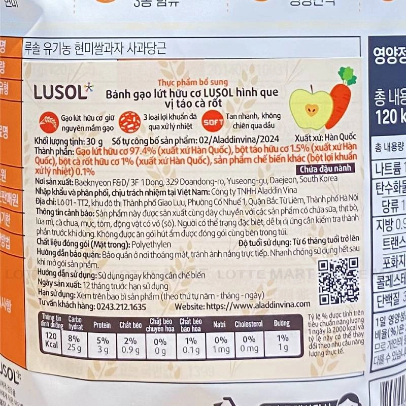 - Bánh Ăn Dặm Lusol Gạo Lứt Vị Táo Và Cà Rốt là một món ăn dặm tuyệt vời cho bé yêu, được làm từ gạo lứt hữu cơ xuất xứ từ Hàn Quốc. Sản phẩm giữ nguyên mầm gạo, chứa tới 66% chất dinh dưỡng, mang đến nguồn năng lượng và vitamin cần thiết cho sự phát triển của trẻ. Vị táo ngọt ngào kết hợp với cà rốt thơm ngon không chỉ kích thích vị giác mà còn bổ sung thêm dưỡng chất cho bé.