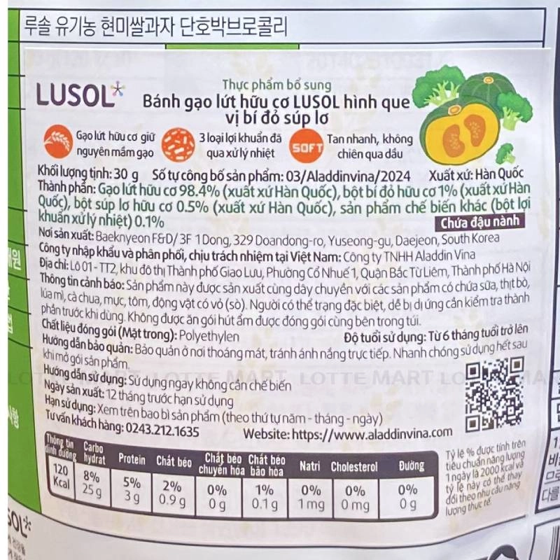 - Bánh Ăn Dặm Lusol Gạo Lứt Vị Bí Đỏ và Súp Lơ là món ăn dặm bổ dưỡng và hấp dẫn dành cho bé, được làm từ gạo lứt xuất xứ Hàn Quốc. Sản phẩm giữ nguyên mầm gạo, chứa tới 66% chất dinh dưỡng, giúp cung cấp năng lượng và vitamin cần thiết cho sự phát triển của trẻ. Với sự kết hợp hương vị thơm ngon của bí đỏ và súp lơ, bánh không chỉ ngon miệng mà còn kích thích vị giác của bé, tạo nên những bữa ăn thú vị và bổ dưỡng.