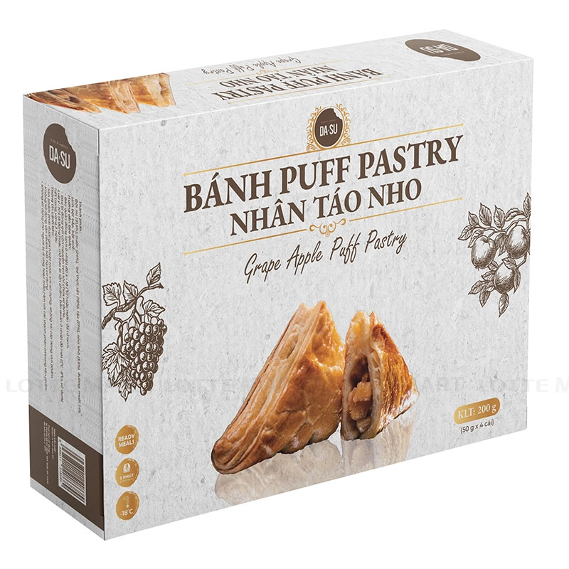 - Bánh Puff Pastry Nhân Táo Nho Dasumy có lớp vỏ ngàn lớp giòn rụm được cán nhiều lần xen kẽ cùng lớp bơ, tạo nên kết cấu tơi xốp và giòn nhẹ khi thưởng thức.