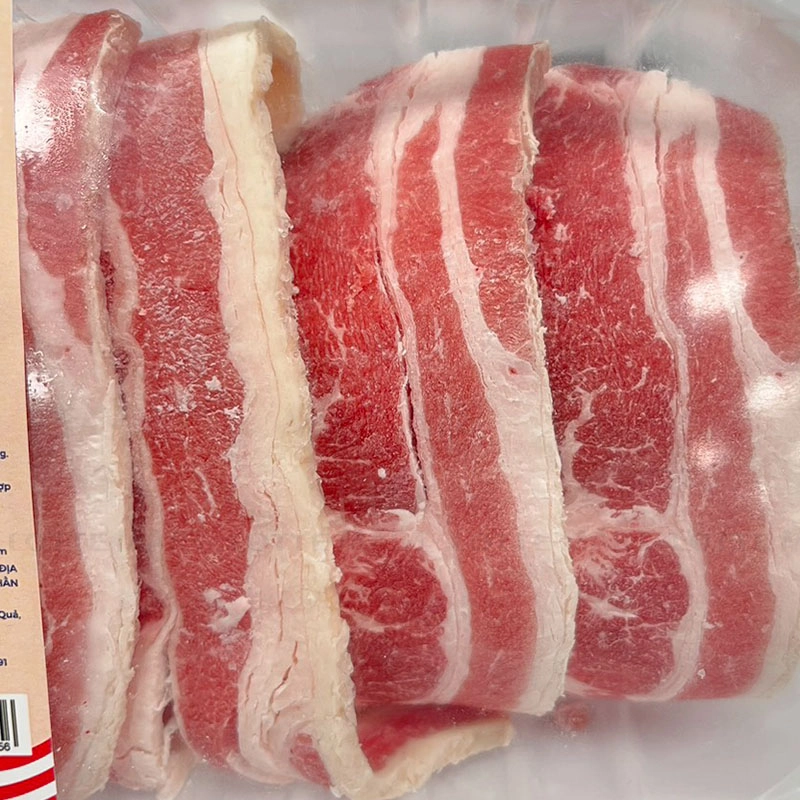 Phần ba chỉ bò được cắt lát mỏng đều, với các đường vân nạc và mỡ đan xen đẹp mắt, mang đến độ mềm và hương vị béo ngậy khi chế biến.