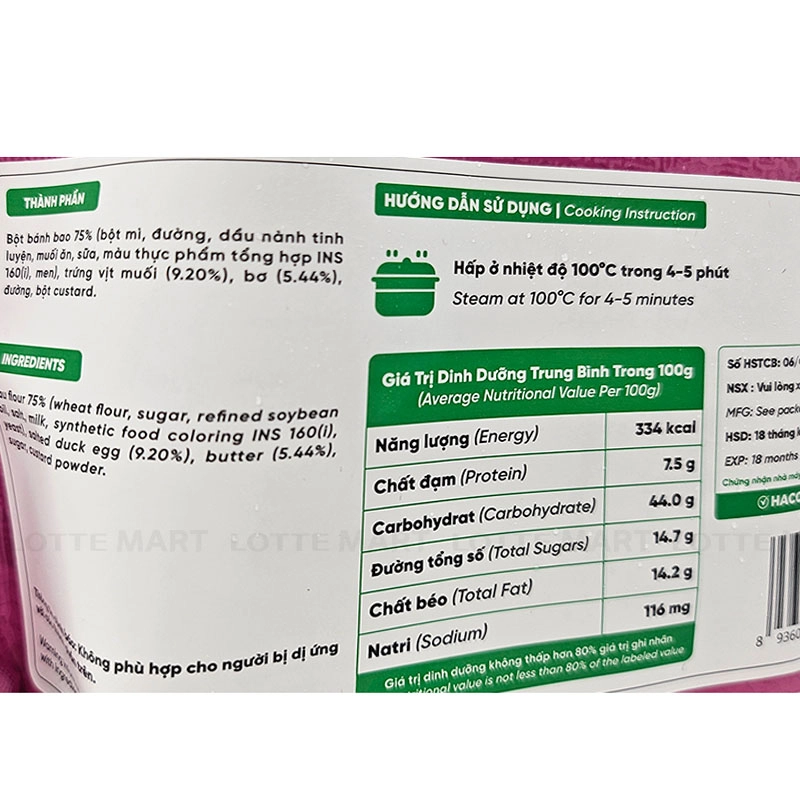 Thành phần: bột bánh bao (75%), trứng gà (9.21%), bơ (5.44%), đường, bột custard, nước.