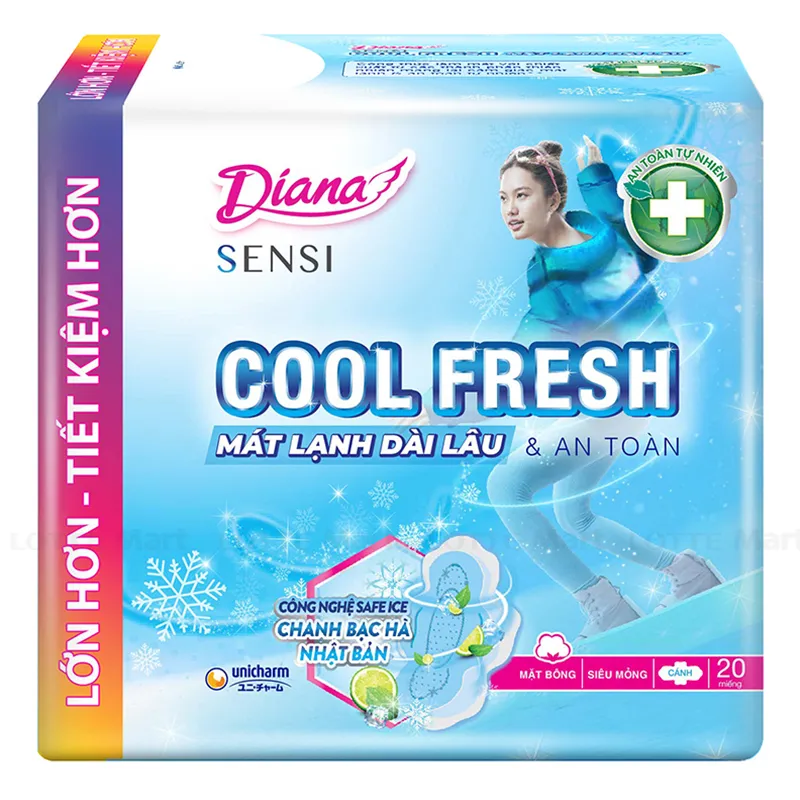 - Băng Vệ Sinh Diana Sensi Cool Fresh Siêu Mỏng sử dụng công nghệ Safe Ice và chiết xuất từ Chanh Bạc Hà Nhật Bản, mang lại cảm giác mát nhẹ dịu và kiểm soát mùi hiệu quả.