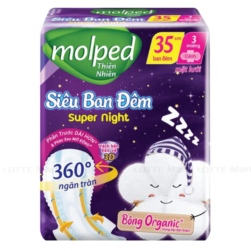 - Băng Vệ Sinh Molped Tự Nhiên Siêu Ban Đêm Cánh 35Cm 3 Miếng với công nghệ vách 3D, bạn không cần lo lắng về tràn băng. Và Molped còn hiệu quả hơn với phần sau băng mở rộng 60%, hoàn toàn yên tâm cho giấc ngủ ngon trọn vẹn cả đêm.