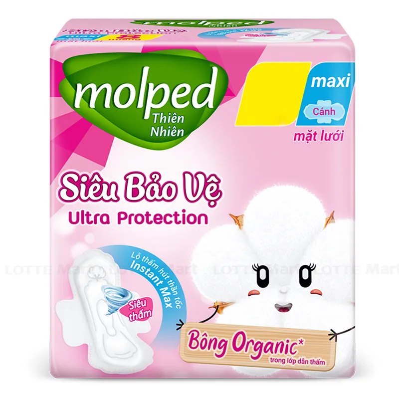 - Sản phẩm mang đến cho bạn bề mặt sau thoáng khí, cho cảm giác khô thoáng dễ chịu cả ngày và đêm. Không còn khó chịu hay mẩn ngứa, Molped có cấu tạo từ bông cotton Organic đem đến sự êm mềm va dễ chịu cho làn da trong kỳ kinh nguyệt.