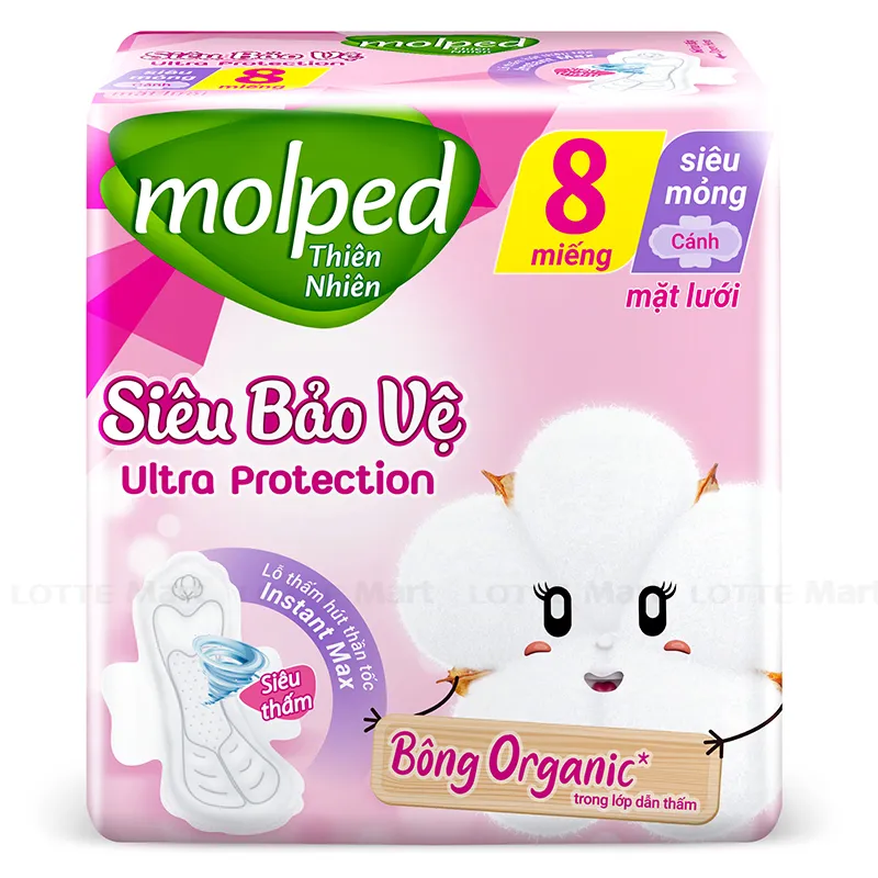 - Sản phẩm mang đến cho bạn bề mặt sau thoáng khí, cho cảm giác khô thoáng dễ chịu cả ngày và đêm. Không còn khó chịu hay mẩn ngứa, Molped có cấu tạo từ bông cotton Organic đem đến sự êm mềm va dễ chịu cho làn da trong kỳ kinh nguyệt.