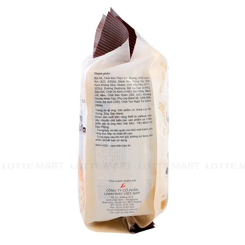 - Bột mì, chất béo thực vật, đường, chất làm ẩm (422, 420 (ii)), mạch nha, trứng gà, bột kem không sữa, gluten, chất nhũ hóa (471, 322 (ii)), đường dextroza, bột cacao (0.9%), sữa bột, chất ổn định (1442), bột whey, muối i-ốt, men, chất bảo quản (282, 202), hương socola nhân tạo, phụ gia bánh mì, chất điều chỉnh độ acid (330), chất tạo ngọt tự nhiên (960a).