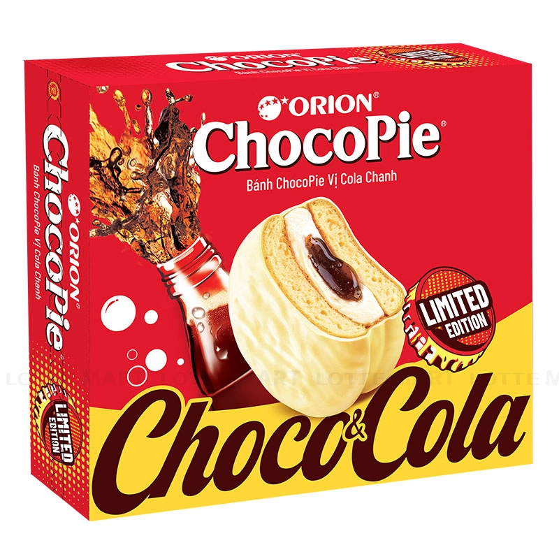 Bánh Orion Chocopie Vị Cola Chanh với sự kết hợp của hương vị Cola, tạo nên phiên bản Chocopie mới lạ chưa từng có, khơi gợi cảm giác hoài niệm về hương vị Coca-Cola mát lạnh gắn liền với tuổi thơ.