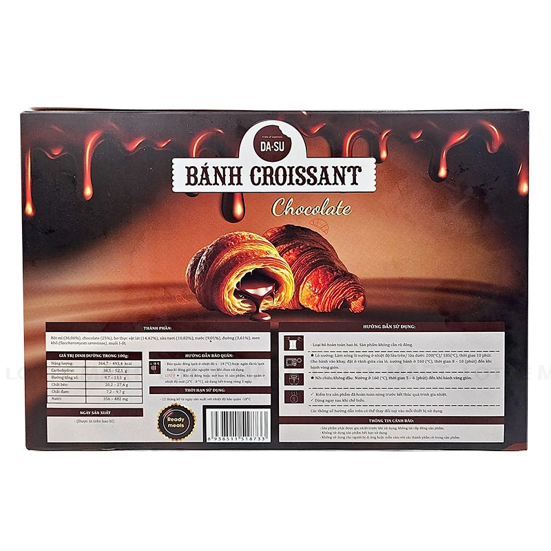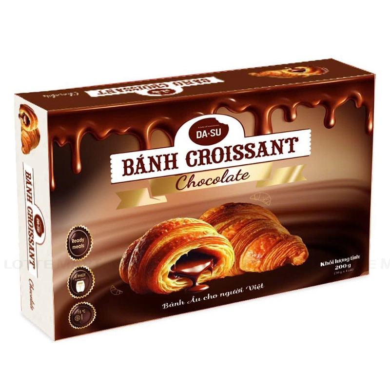 - Bánh Croissant Socola Dasumy có lớp vỏ mỏng được cán tỉ mỉ nhiều lần, tạo nên hàng trăm lớp bột mỏng đan xen cùng lớp bơ thơm béo. Nhờ vậy, khi nướng lên, bánh đạt được độ giòn xốp đặc trưng, tách lớp rõ ràng và vàng đều đẹp mắt.