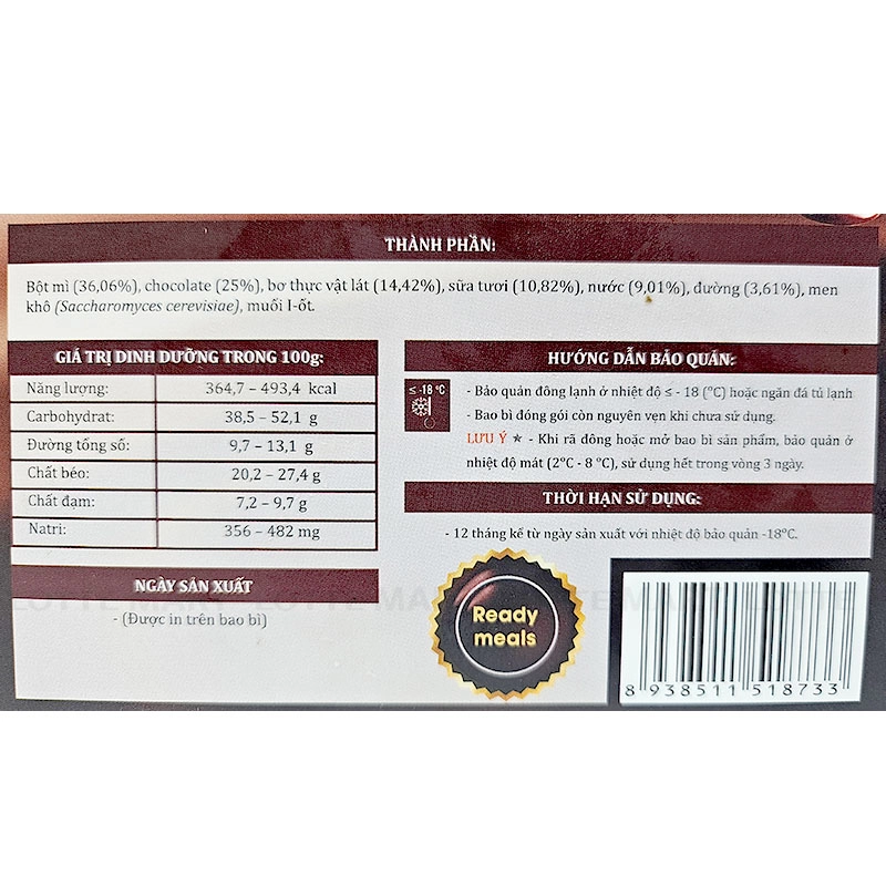 - Bột mì (36.06%), chocolate (25%), bơ thực vật (14.42%), sữa tươi (10.82%), nước (9.01%), đường (3.61%), muối i-ốt, men khô (Saccharomyces cerevisiae).