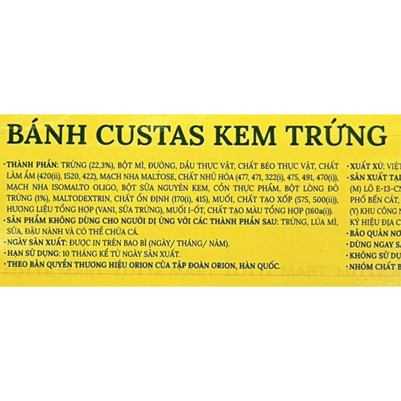 - Trứng, bột mì, dầu thực vật, chất béo thực vật hydro hoá hoàn toàn, chất giữ ẩm, chất nhũ hoá, isomalto oligo syrup, bột sữa nguyên kem, bột lòng đỏ trứng, cồn thực phẩm, hương thực phẩm, ...