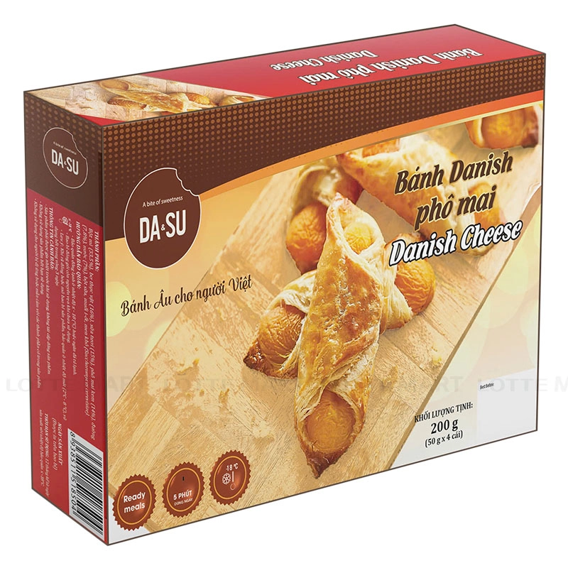 - Bánh Danish Phô Mai Dasumy được tạo hình tỉ mỉ với kỹ thuật cán và gập nhiều lớp xen kẽ cùng bơ, giúp vỏ nở đều, tách lớp rõ và mang lại độ giòn nhẹ đặc trưng khi thưởng thức.