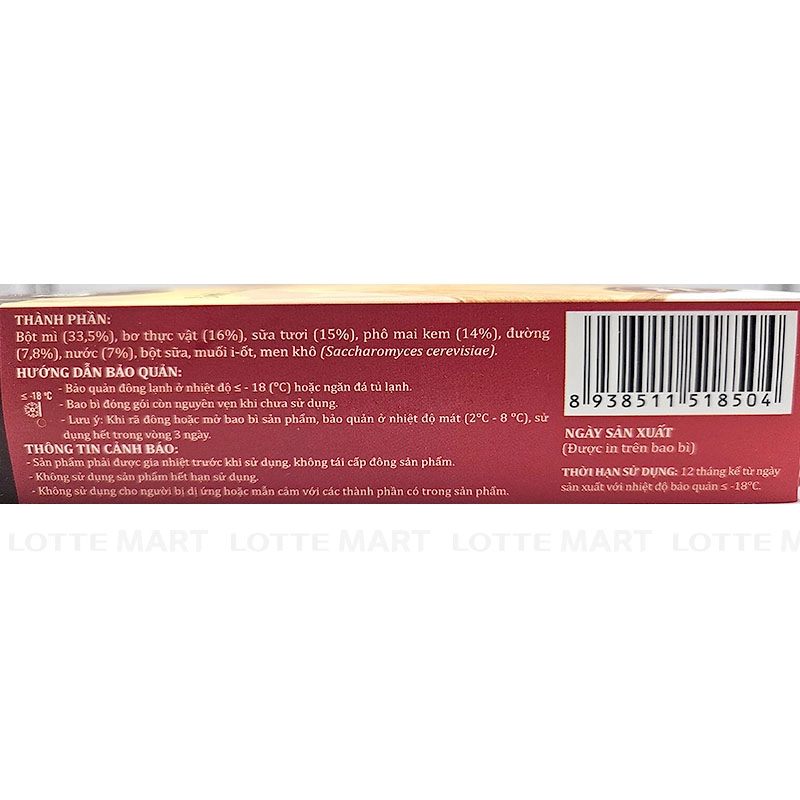 - Bột mì (33.5%), bơ thực vật (16%), sữa tươi (15%), phô mai kem (14%), đường (7.8%), nước (7%), bột sữa, muối i-ốt, men khô (Saccharomyces cerevisiae).