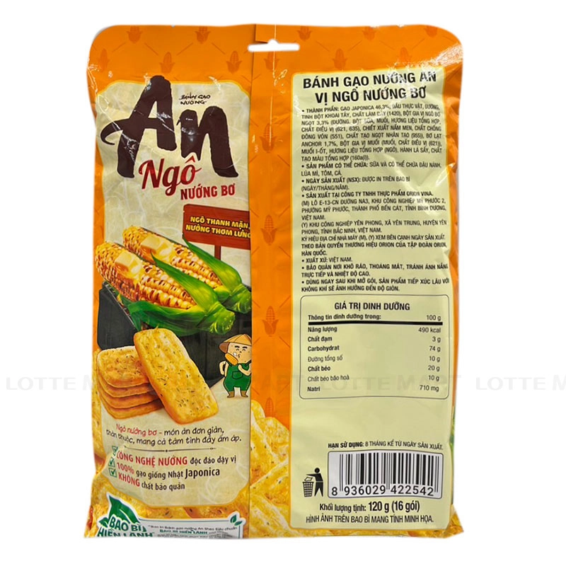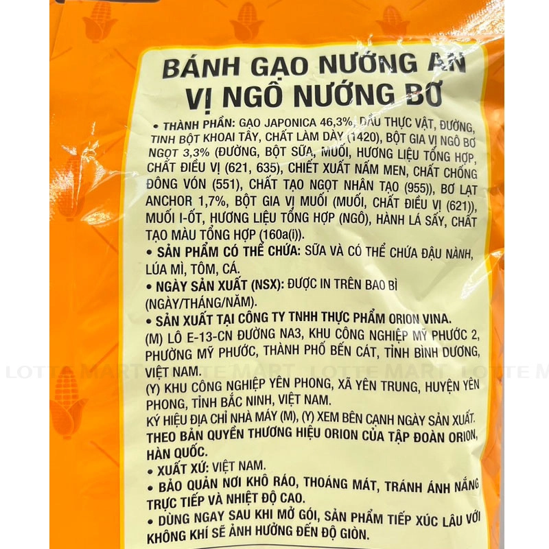 - Bánh Gạo Nướng Orion An Vị Ngô Nướng Bơ là sản phẩm được sản xuất từ 100% gạo giống Nhật Japonica được chăm chút từng chiếc bánh trong từng công đoạn để mang đến sản phẩm chất lượng nhất khi đến tay người tiêu dùng.