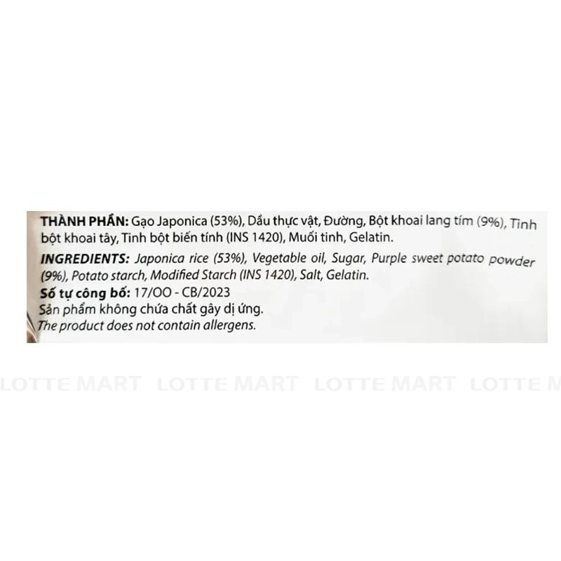 - Gạo Japonica (53%), dầu thực vật, đường, bột khoai lang tím (9%), tinh bột khoai tây, tinh bột biến tính, muối tinh, gelatin.