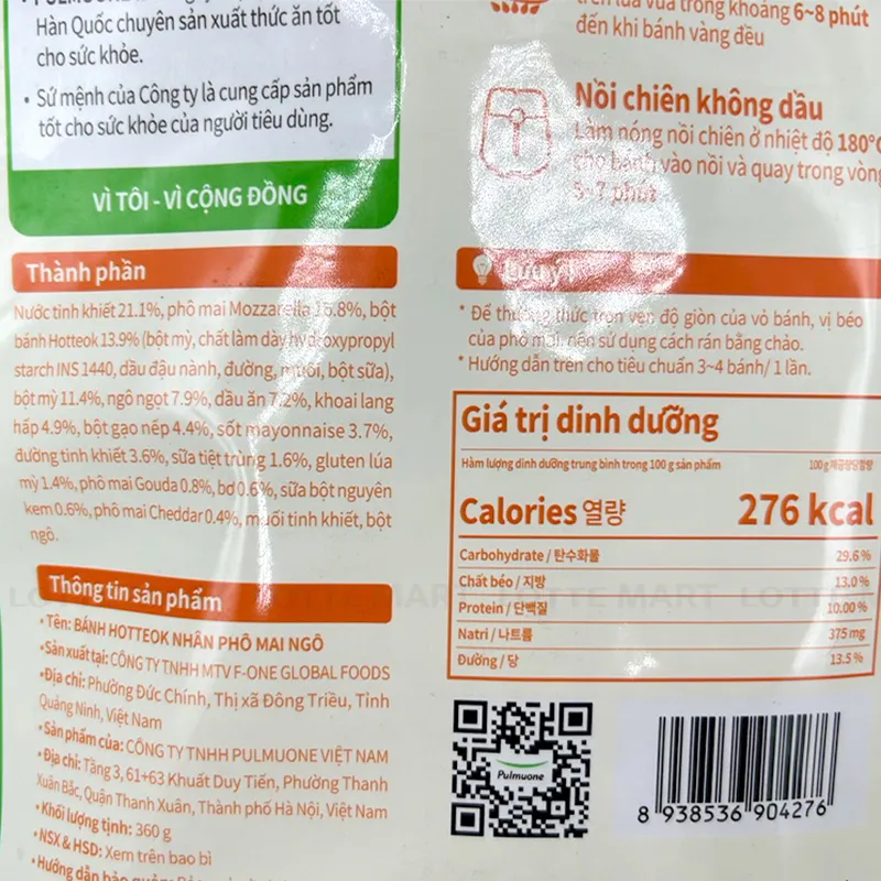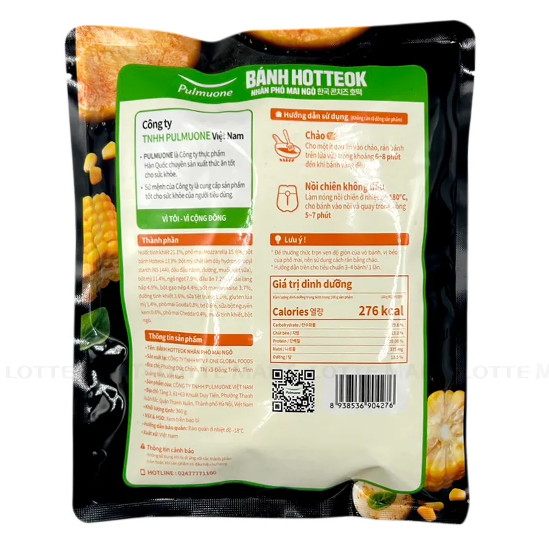 - Bánh Hotteok Phô Mai Ngô Pulmuone Gói 360G có kết cấu dai bên ngoài, ẩm bên trong với lớp vỏ bánh được làm bằng bột bánh hotteok đặc trưng tạo nên độ dẻo dai hấp dẫn. Nhân bánh là một sự hào quyện hấp dẫn giữa nhiều thành phần kết hợp như phô mai, bắp ngọt, khoai lang hấp, sữa bột nguyên kem, mayonnaise, sữa tiệt trùng, đường, muối.