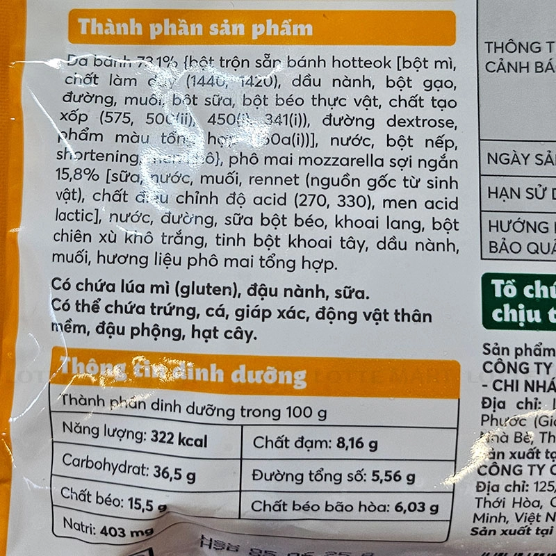 - Da bánh 73.1% { bột trộn sẵn bánh hotteok [bột mì, chất làm dày (1440, 1420), dầu nành, bột gạo, đường, muối, bột sữa, bột béo thực vật, chất tạo xốp (575, 500(ii), 450(i), 341(i)), đường dextrose, phẩm màu tổng hợp], nước, bột nếp, shortening, men khô } , phô mai mozzarella sợi ngắn 15.8% [sữa, nước, muối, rennet (nguồn gốc từ sinh vật), chất điều chỉnh độ acid (270, 330), men acid lactic], nước, đường, sữa bột béo, khoai lang, bột chiên xù khô trắng, tinh bột khoai tây, dầu nành, muối, hương liệu phô mai tổng hợp.