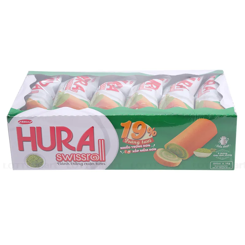- Bánh Hura Swissroll Hương Cốm với công thức độc đáo thật mềm mịn, tan ngay trong miệng, thơm ngon vị trứng sữa và đậm đà nhân kem cốm.