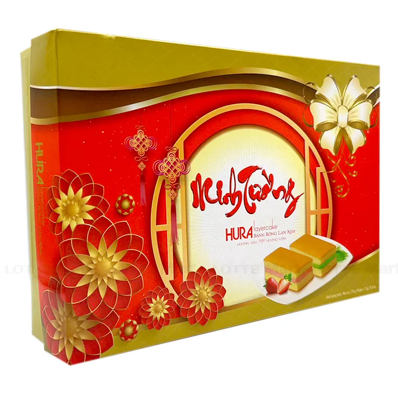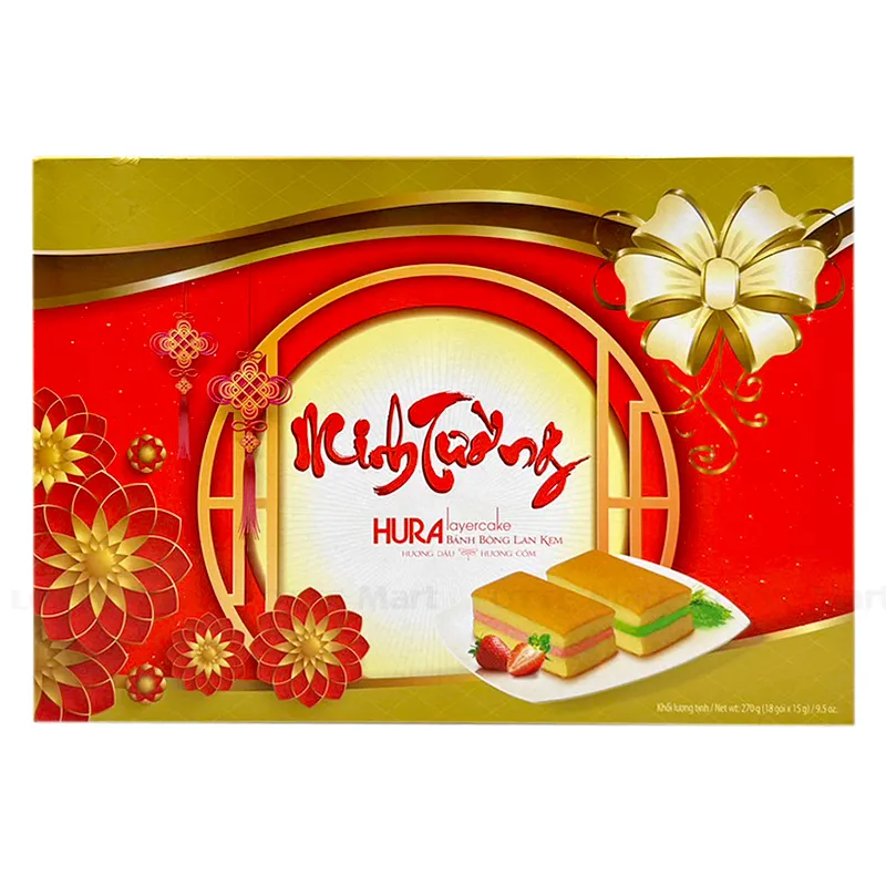 - Bánh bông lan kem hương cốm Hura Layer Cake: bột mì, trứng, shortening, đường, mạch nha, dầu thực vật tinh luyện, tinh bột bắp, hương liệu (cốm, vani, sữa, bơ, chanh),...