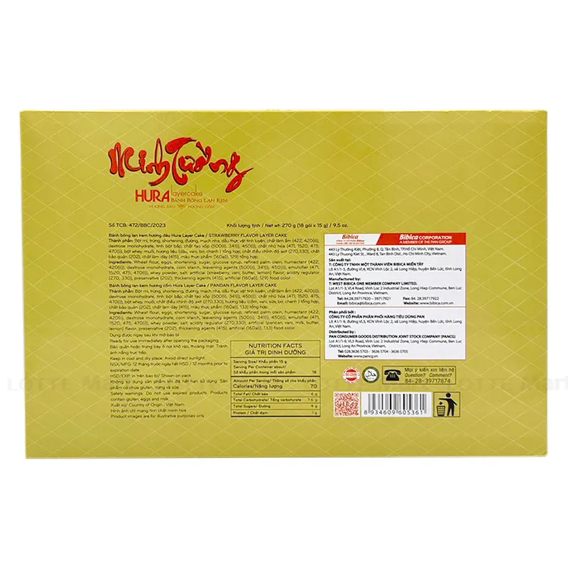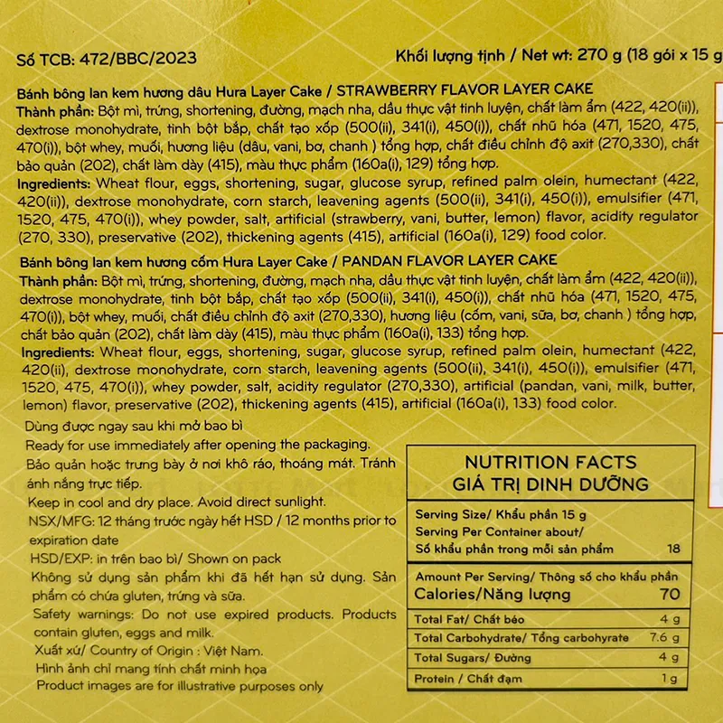 - Bánh bông lan kem hương dâu Hura Layer Cake: bột mì, trứng, shortening, đường, mạch nha, dầu thực vật tinh luyện, tinh bột bắp,...