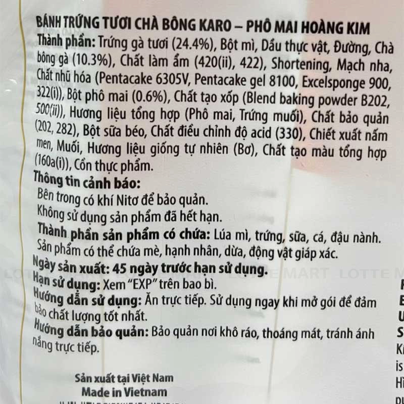 - Bánh Karo Chà Bông Tươi Phô Mai Hoàng Kim sở hữu hương vị đặc biệt, là sự hòa quyện hoàn hảo giữa trứng tươi, chà bông và phô mai, mang đến hương vị đậm đà và ngon miệng.