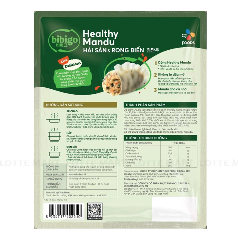 - Bánh Mandu Hải Sản Rong Biển bibigo Gói 280G là sự kết hợp hoàn hảo giữa hương vị truyền thống và xu hướng ăn uống lành mạnh hiện đại, tốt cho sức khỏe, ít béo, ít đường.