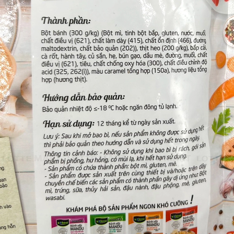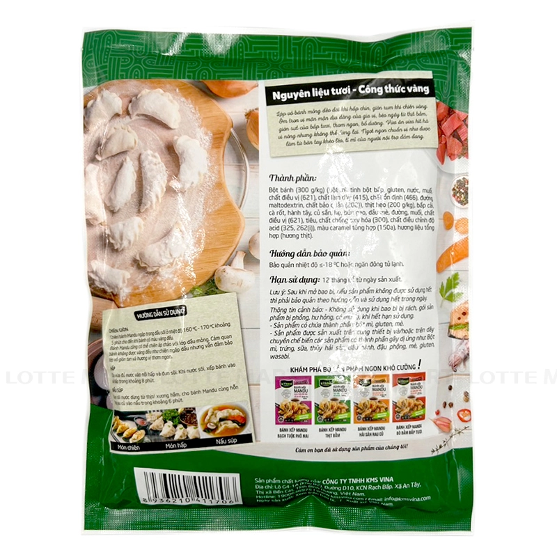 - Bánh Mandu thịt bằm LC Foods được sản xuất theo công nghệ hiện đại, tiên tiến, không chứa chất phụ gia, chất bảo quản, chất chống oxy hóa đảm bảo an toàn cho sức khỏe của gia đình bạn khi chế biến món ăn. Ngoài ra, sản phẩm có khối lượng 350g, tiện lợi cho một lần sử dụng.