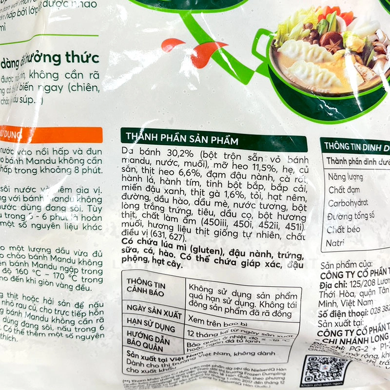- Da bánh 30.2% (bột trộn sẵn vỏ bánh mandu, nước, muối), mỡ heo 11.5%, hẹ, củ sắn, thịt heo 6.6%, đạm đậu nành, cà rốt, hành lá, hành tím, tinh bột bắp, bắp cải, miến đậu xanh, thịt gà 1.6%, tỏi, hạt nêm, đường, dầu hào, dầu mè, nước tương, bột lòng trắng trứng, tiêu, dầu cọ, bột hương thịt, chất làm ẩm (450iii, 450i, 452ii, 451i), muối, hương liệu thịt giống tự nhiên, chất điều vị (631, 627).