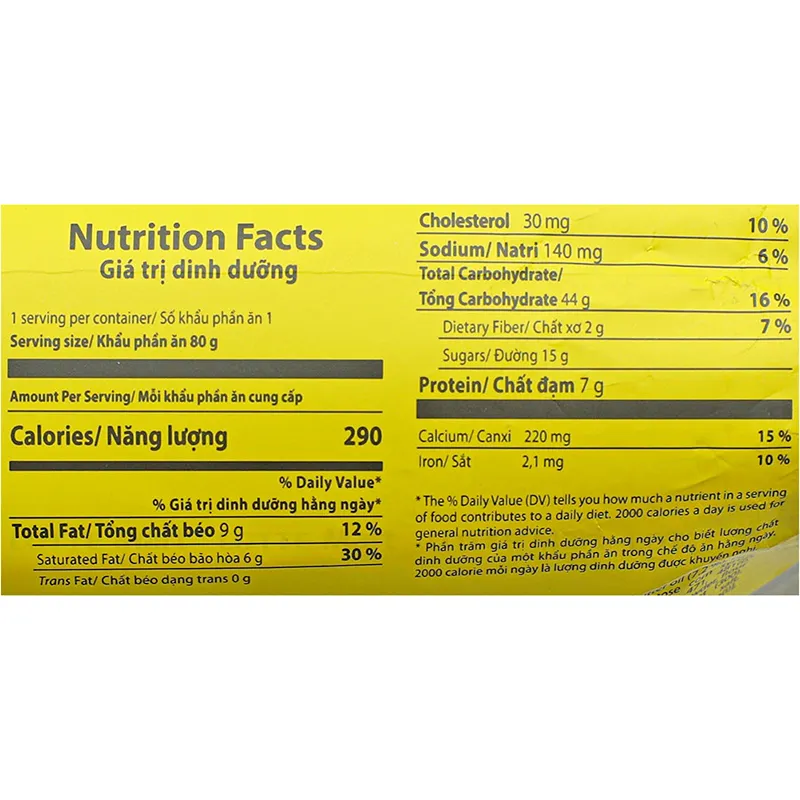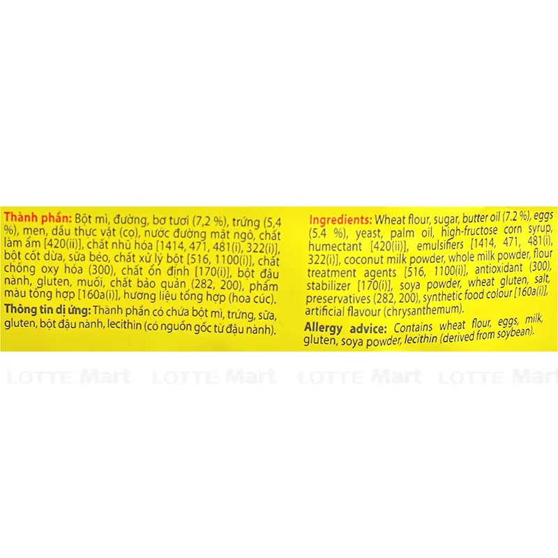 - Bột mì, đường, bơ tươi 7.2%, trứng 5.4%, men, dầu thực vật (dầu cọ), nước đường mật ngô, chất làm ẩm, chất nhũ hóa, bột cốt dừa, sữa béo, chất xử lí bột, chất chống oxy hóa, chất ổn định, bột đậu nành, gluten, muối, chất bảo quản, phẩm màu tổng hợp, hương liệu tổng hợp (hoa cúc).