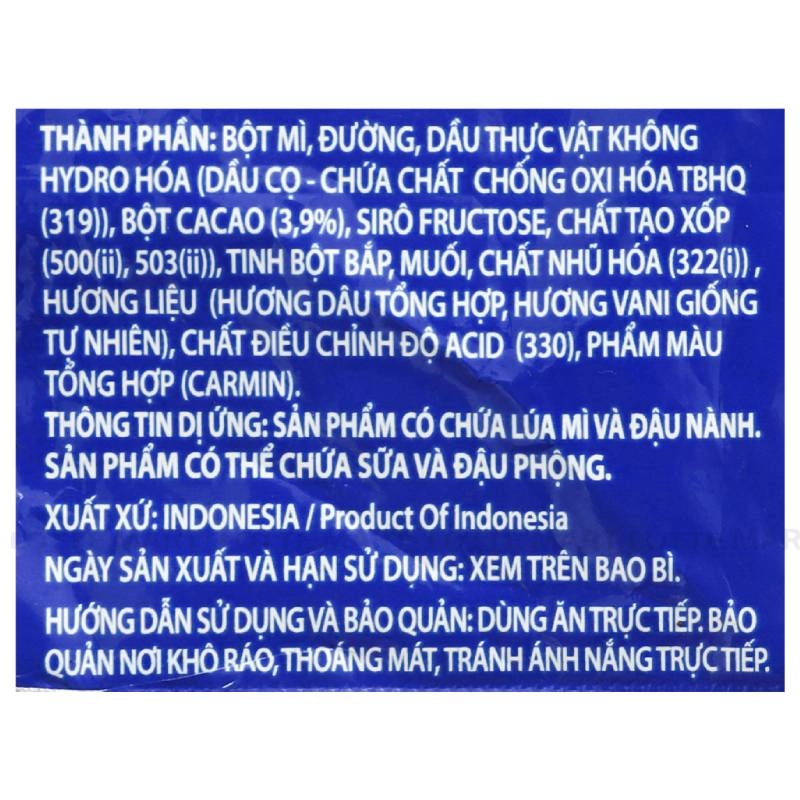 Thành phần: Bột mì, dầu thực vật, dầu cọ, bột cacao, siro tructose, bột bắp, muối, bột nở, lecithin đậu nành, hương vani và dâu, acid citric, màu carmin, bột dâu