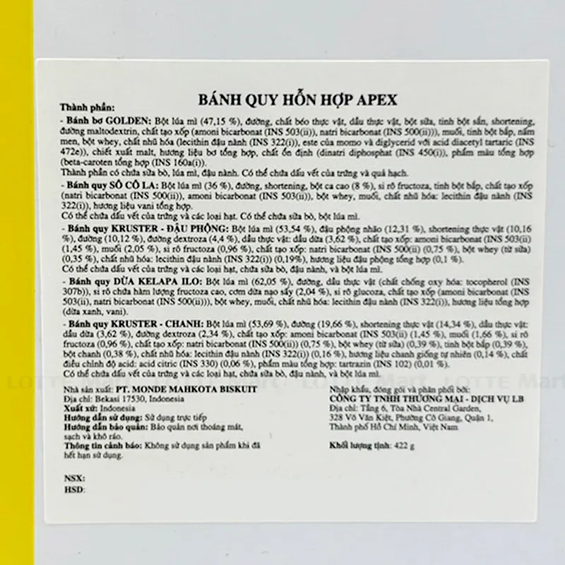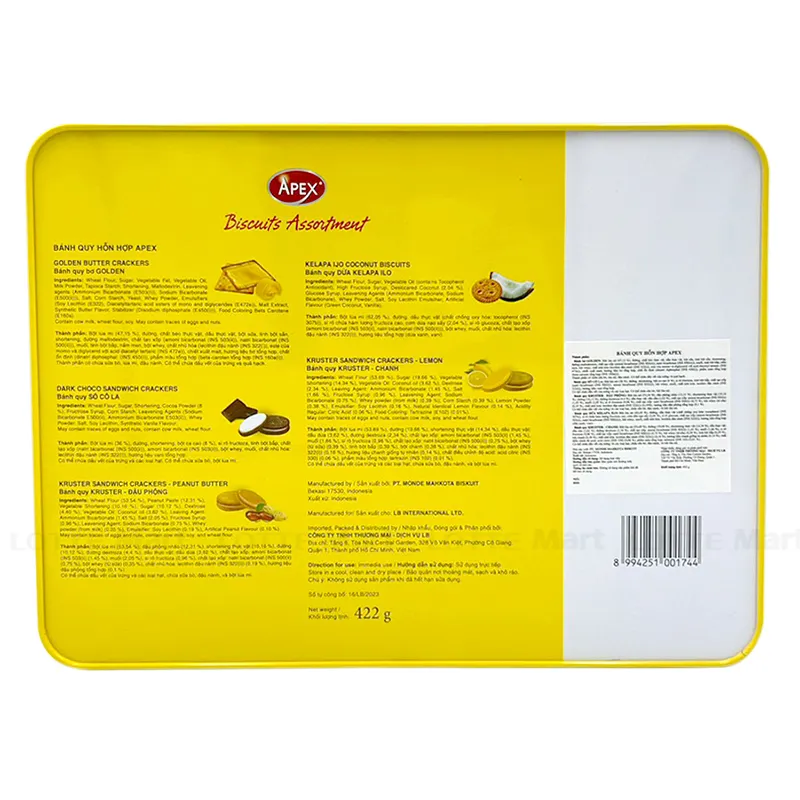 - Bánh Quy Apex Hỗn Hợp là sự chọn lựa tuyệt vời cho những buổi dã ngoại, tiệc trà, món ăn nhẹ đầy thơm ngon dinh dưỡng. Sản phẩm được sản xuất theo công nghệ hiện đại, không sử dụng chất bảo quản độc hại, đảm bảo an toàn cho sức khỏe người tiêu dùng.