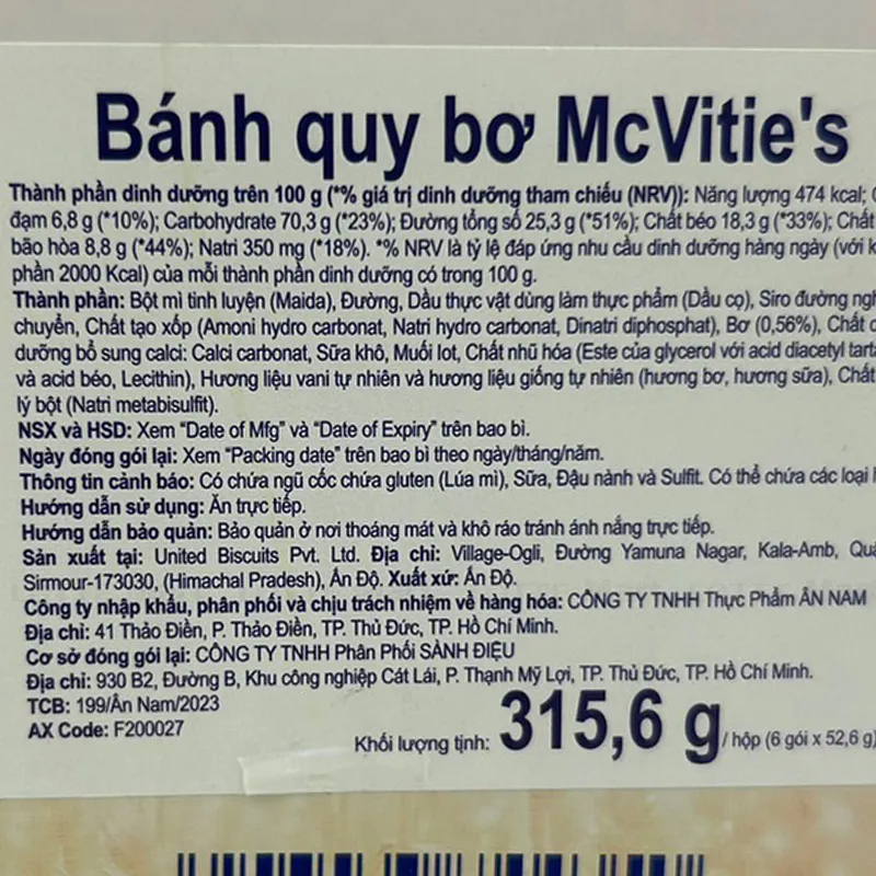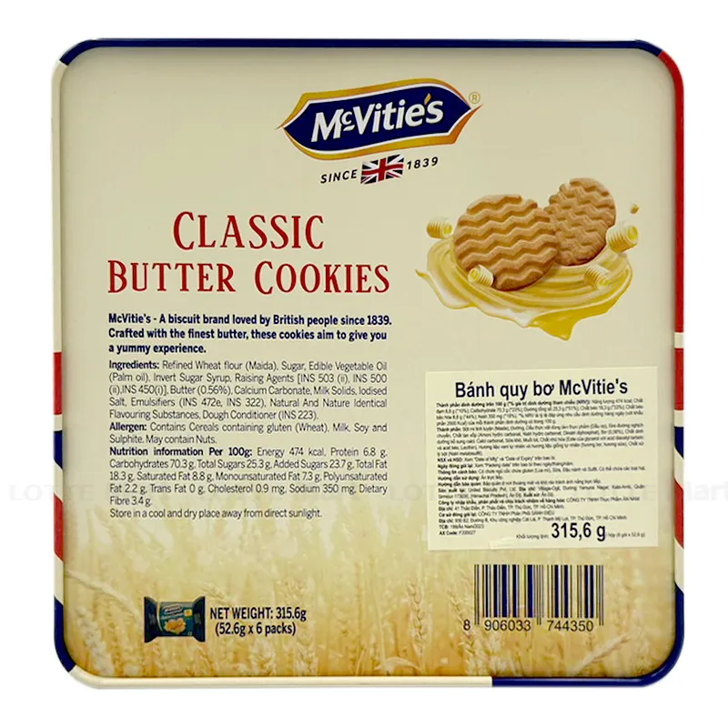 - Bánh Quy Bơ McVitie's Hộp Thiếc 315.6G giòn rụm, vị bánh ngọt dịu tan ngay trong miệng giúp bổ sung năng lượng và chất dinh dưỡng hợp lý cho người tiêu dùng. Bánh chứa nhiều thành phần tốt cho sức khỏe, giúp bổ sung năng lượng, dùng làm bữa ăn nhẹ, cho bạn một ngày hoạt động, làm việc hiệu quả.