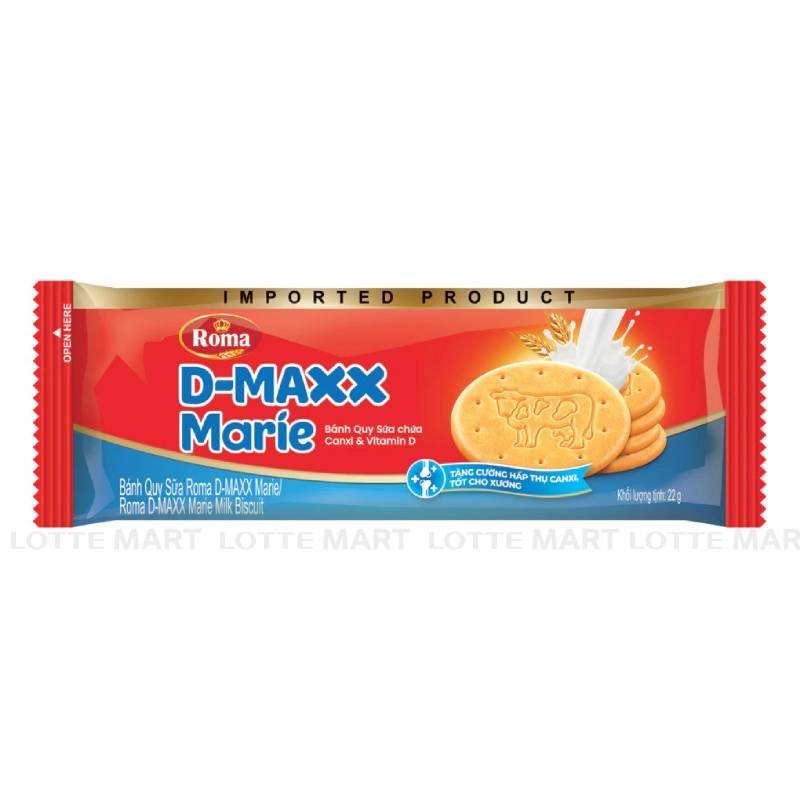 - Bánh Quy Sữa Roma D-MAXX Marie mang hương vị ngọt vừa và rất dễ ăn. Lớp bánh mỏng, giòn tan khi nhai, kết hợp với vị sữa thơm mát tạo nên một trải nghiệm hài hòa, rất thích hợp để thưởng thức cùng trà, cà phê, hoặc đơn giản là ăn vặt khi cần.