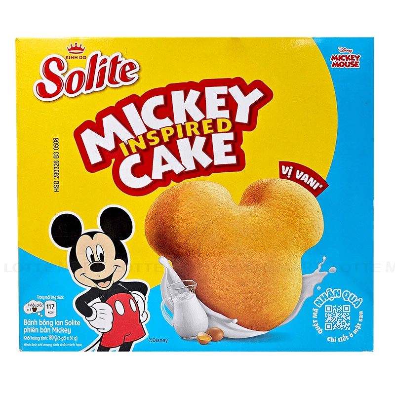 Bánh Bông Lan Solite Phiên Bản Mickey với hương vị Vani ngọt dịu và kết cấu mềm mịn, phù hợp với mọi lứa tuổi, đặc biệt là trẻ em nhờ hình dáng chú chuột Mickey dễ thương.