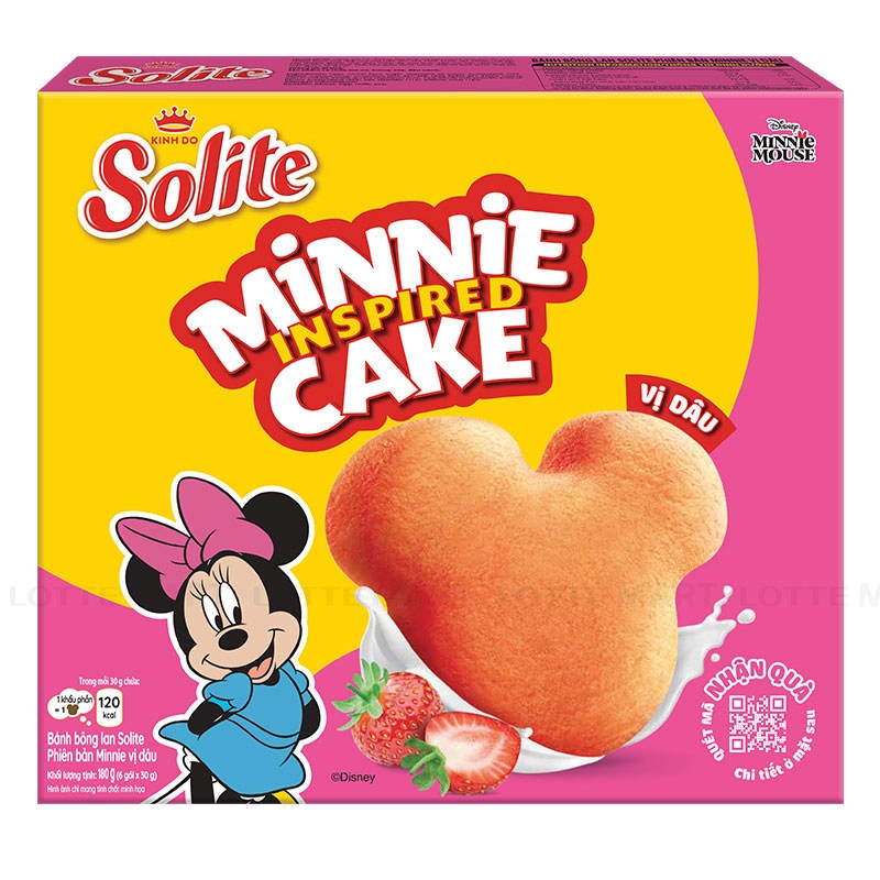 - Bánh Bông Lan Solite Minnie Vị Dâu là sản phẩm bánh được thiết kế hình ảnh dễ thương của nhân vật hoạt hình nổi tiếng Minnie, không chỉ hấp dẫn về hương vị mà còn thu hút trẻ em và người lớn.