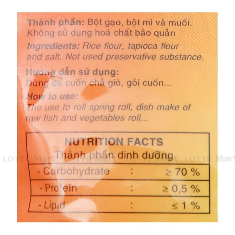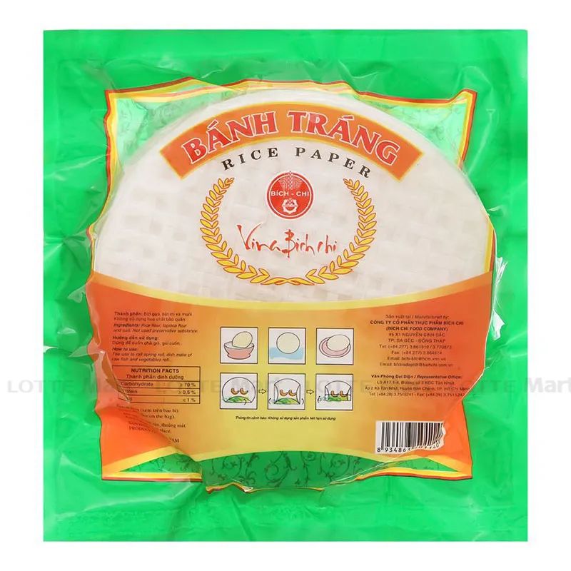 Bánh Tráng Bích Chi 16CM 400G làm từ bột gạo và bột mì được chọn lọc cẩn thận và sản xuất trên dây chuyền hiện đại khép kín, không sử dụng phụ gia độc hại nên tuyệt đối an toàn với sức khỏe người tiêu dùng. Sản phẩm cung cấp hàm lượng tinh bột, protein đáng kể và cung cấp nguồn năng lượng dồi dào cho cơ thể. Các nguyên liệu đều lấy từ tự nhiên, không chứa hóa chất, không sử dụng chất bảo quản, đạt yêu cầu an toàn vệ sinh thực phẩm. Dùng bánh tráng làm nhiều món ăn ngon như gỏi cuốn, ăn kèm bánh xèo, hay làm chả giò, giúp bữa ăn của bạn trở nên thú vị và hấp dẫn hơn.