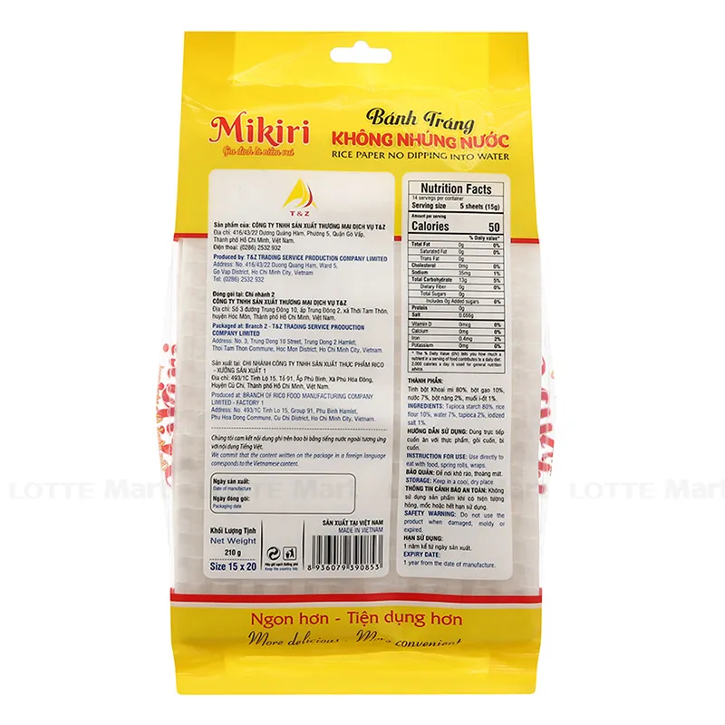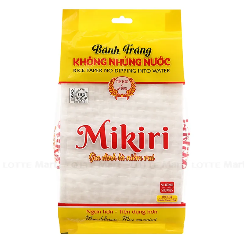 - Bánh Tráng Vuông Mikiri Gói 210G mỏng nhưng rất dẻo và dễ cuốn bạn hoàn toàn yên tâm không sợ bánh bị gãy hay rách khi sử dụng. Điểm đặc biệt của bánh tráng là khi sử dụng bạn hoàn toàn không phải nhúng nước mà sử dụng trực tiếp khi mở bao bì.