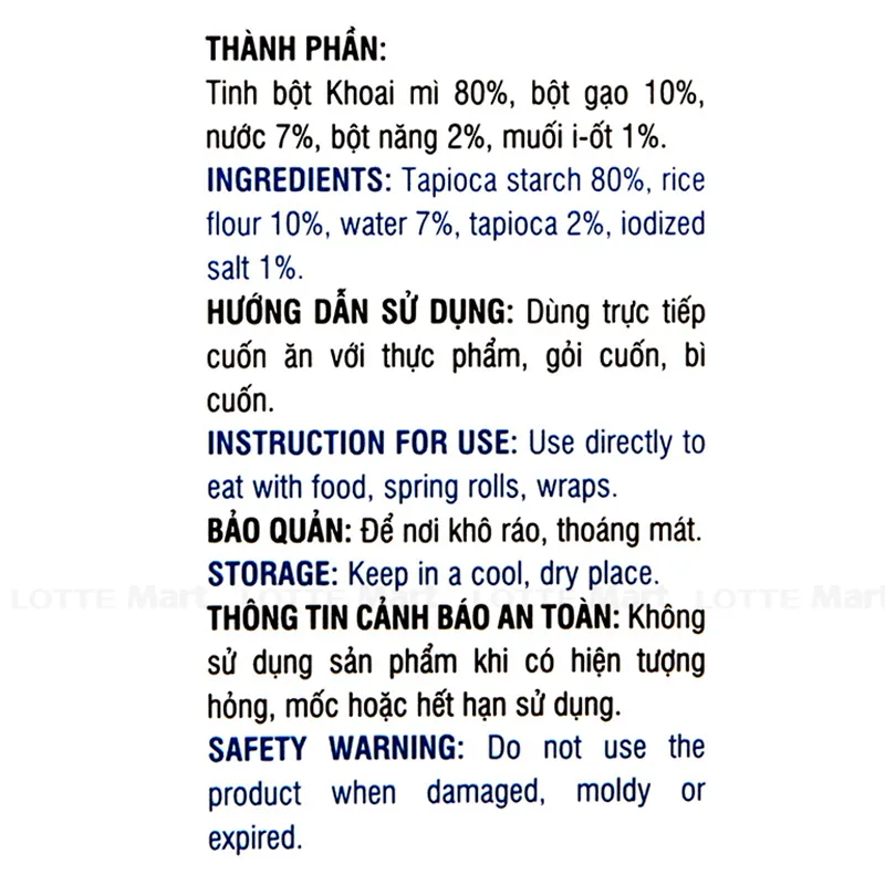 - Tinh bột khoai mì 80%, bột gạo 10%, nước 7%, bột năng 2%, muối i-ốt 1%.