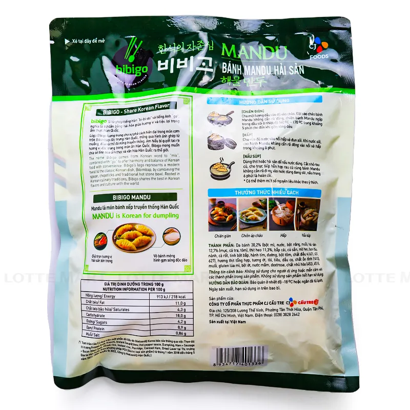 - Bánh Xếp Mandu bibigo Nhân Hải Sản là giải pháp nhanh chóng đối với những người bận rộn, không có nhiều thời gian chuẩn bị bữa ăn. Sản phẩm giúp tiết kiệm thời gian trong khâu sơ chế, chế biến mang đến cho bạn bữa ăn ngon và đầy đủ chất dinh dưỡng.