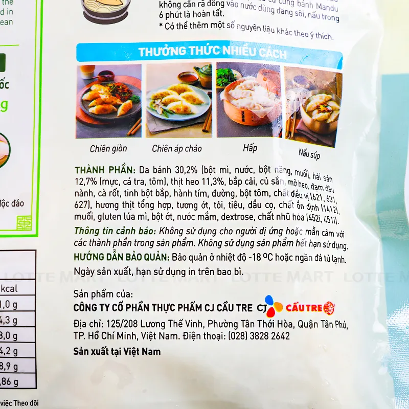 - Bánh Xếp Mandu bibigo Nhân Hải Sản với vỏ bánh mỏng hình gợn sóng, nhân được gói chặt bên trong, gồm thịt và một số loại hải sản băm nhỏ, ướp gia vị vừa ăn.