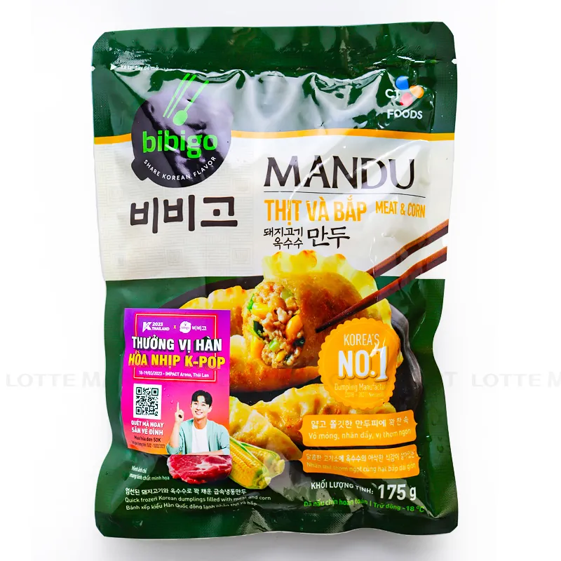 Bánh Xếp Hàn Quốc Nhân Thịt Bắp CJ Cầu Tre Bibigo Gói 175G hay còn gọi là mandu là một món ăn nổi tiếng thuộc thương hiệu Bibigo, một trong những thương hiệu nổi tiếng nhất của Hàn Quốc về các loại bánh xếp Mandu. Bánh xếp Hàn Quốc nhân thịt bắp Bibigo 350g có size vừa ăn với vỏ bánh mỏng hình gợn sóng, bọc bên trong là phần nhân thơm ngọt được làm từ những loại nguyên liệu tự nhiên, an toàn cho sức khoẻ.